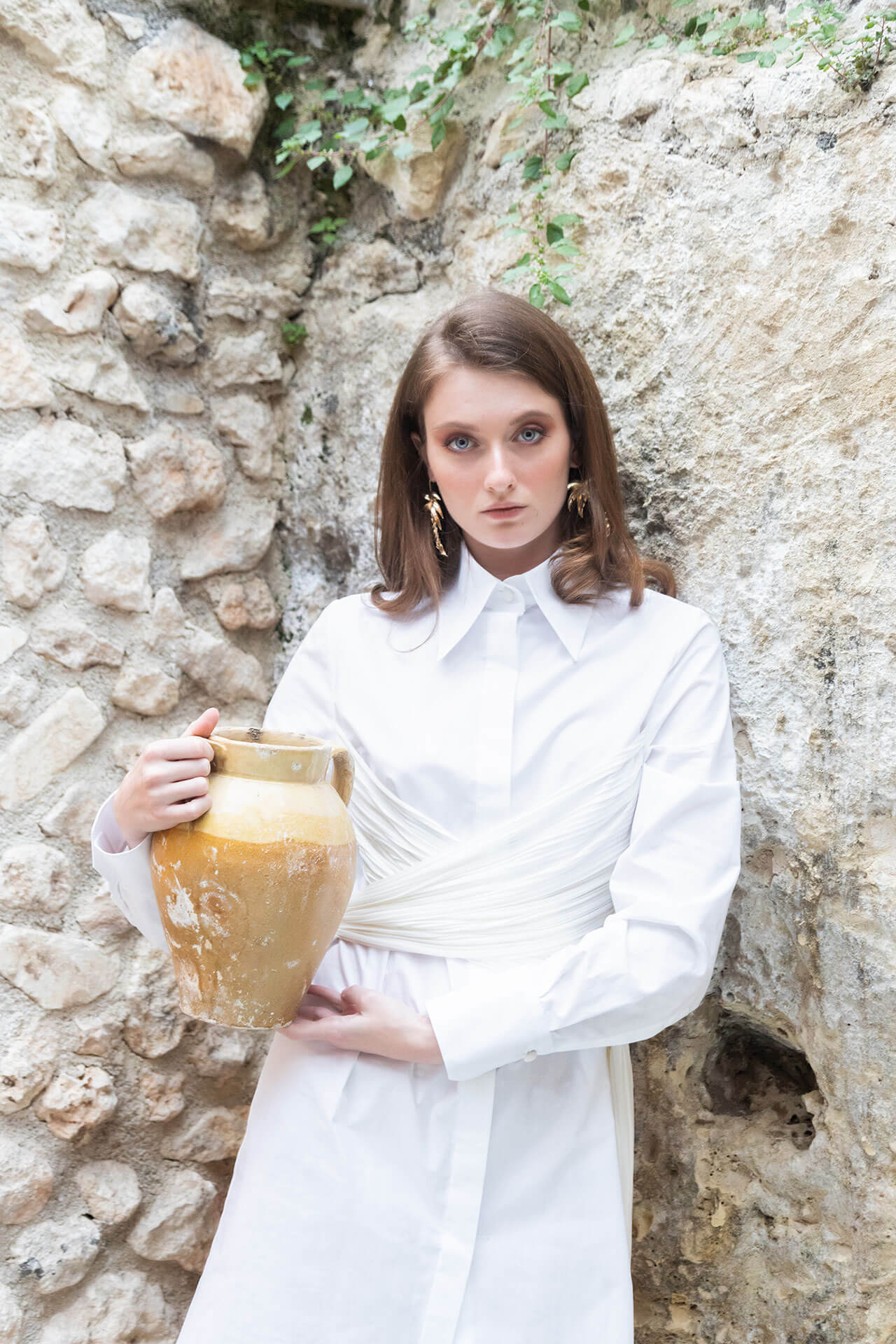 Camicia vestito bianco in cotone arricchita con panneggio plissettato incrociato. Semplice ed elegante: il modello è lineare grazie all’abbottonatura nascosta.
